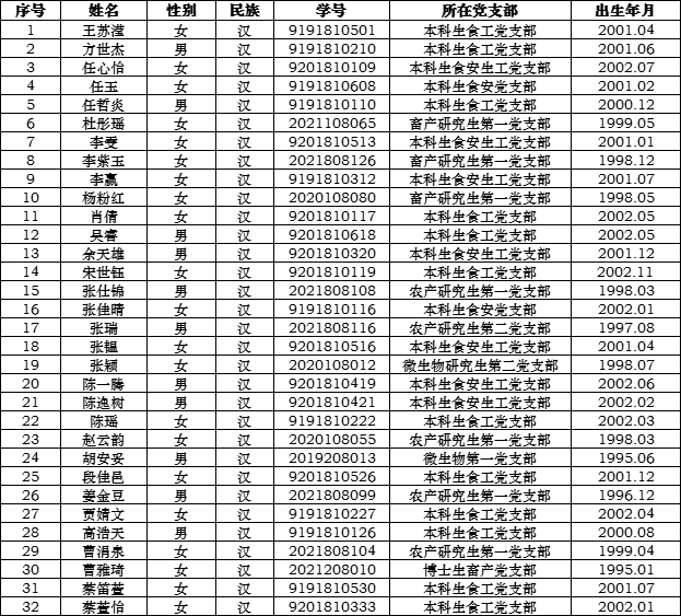 根据《中国共产党章程》、《中国共产党发展党员工作细则(试行)》的有关规定,经团支部推优、入党介绍人谈话考察、学生党支部答辩和投票表决、学校及学院党组织一年以上的线上和线下系列培训教育,以及对发展对象的志愿服务、任职经历、科研水平、学业成绩、创新能力等的综合考察,现拟将王苏滢等 32 位同志确定为党员发展对象。现将具体名单公示如下(按姓氏笔画排序):